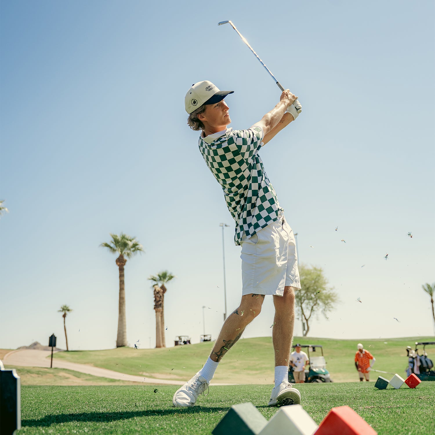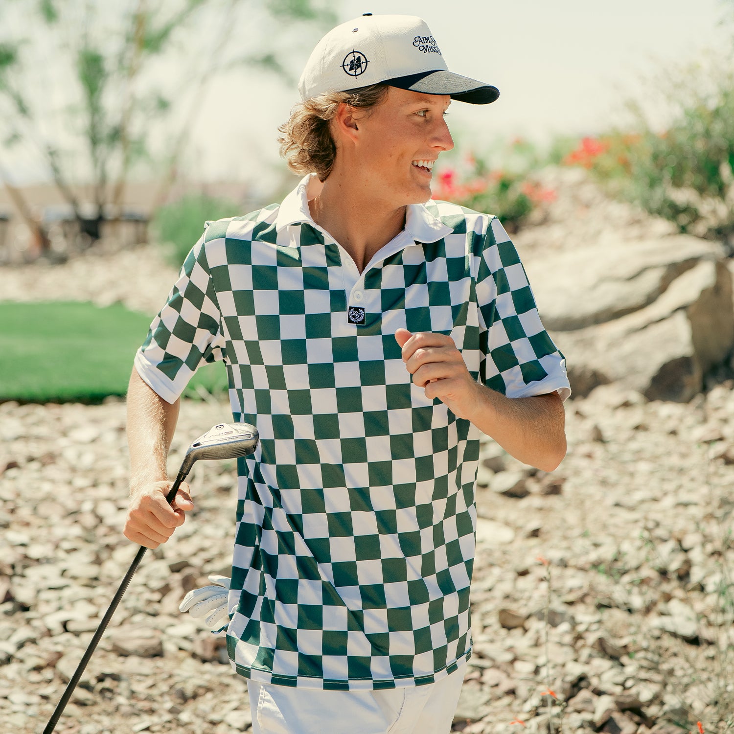 CHECK MATE. The checkered patterns of Dicey's staple colors; Green and White.